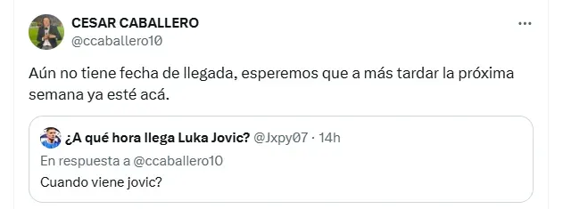 El periodista César Caballero respondió a un aficionado en X que “Aún no tiene fecha de llegada, esperemos que a más tardar la próxima semana ya esté acá”, pero todo depende de cómo se destrabe el tema Giakoumakis.