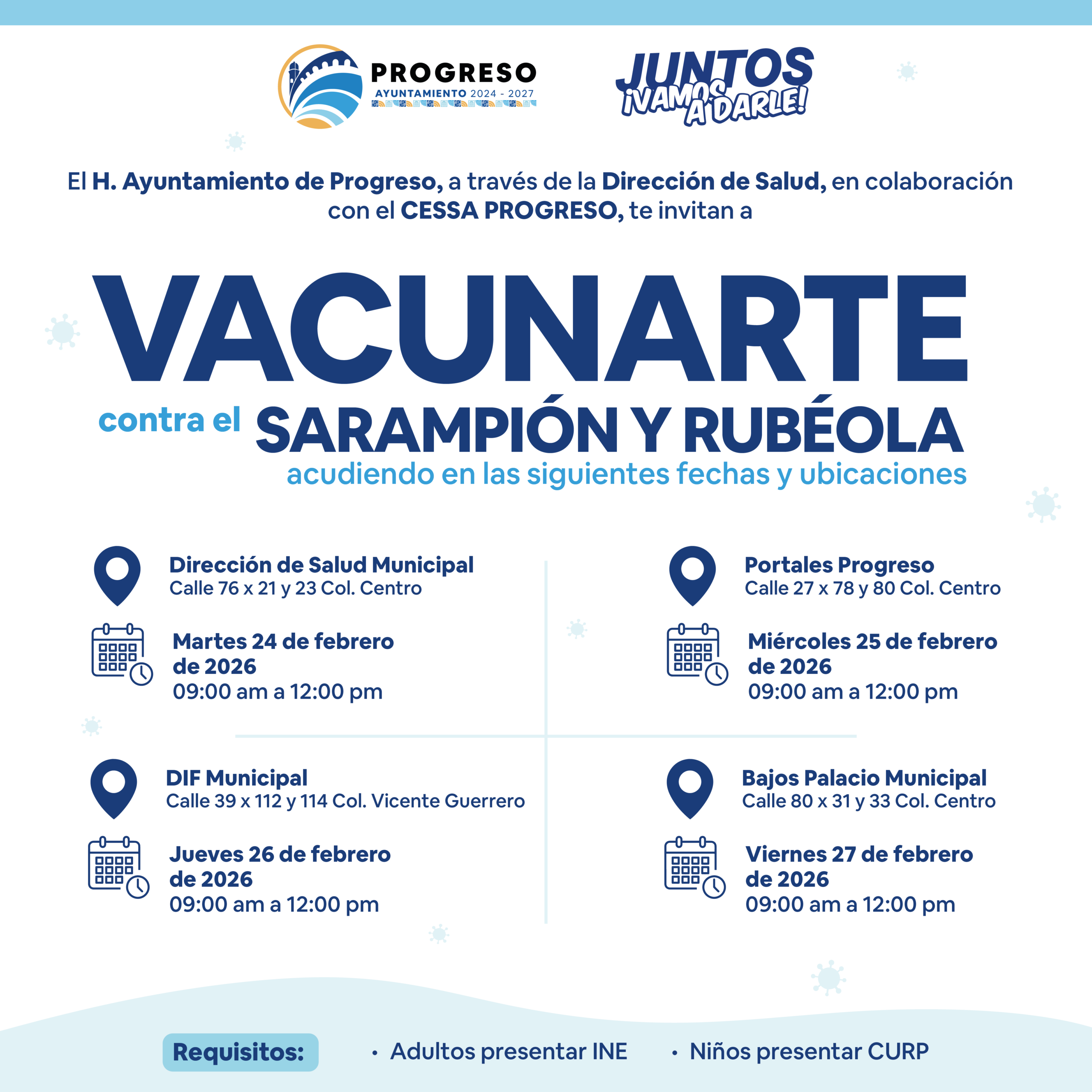 Con el objetivo de fortalecer la salud pública y prevenir enfermedades que pueden evitarse mediante la vacunación, el H. Ayuntamiento de Progreso, encabezado por el alcalde Erik José Rihani González, a través de la Dirección de Salud y en coordinación con el CESSA Progreso, invita a la ciudadanía a participar en la jornada de vacunación contra el sarampión y la rubéola, que se llevará a cabo en distintas sedes del municipio durante la presente semana.