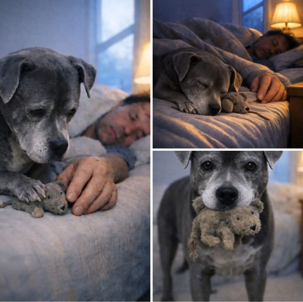 Tres semanas después, ese Pitbull azul grisáceo de quince años estaba recorriendo nuestro pasillo con un ratón de peluche andrajoso en la boca — y finalmente entendimos por qué no se levantaba.