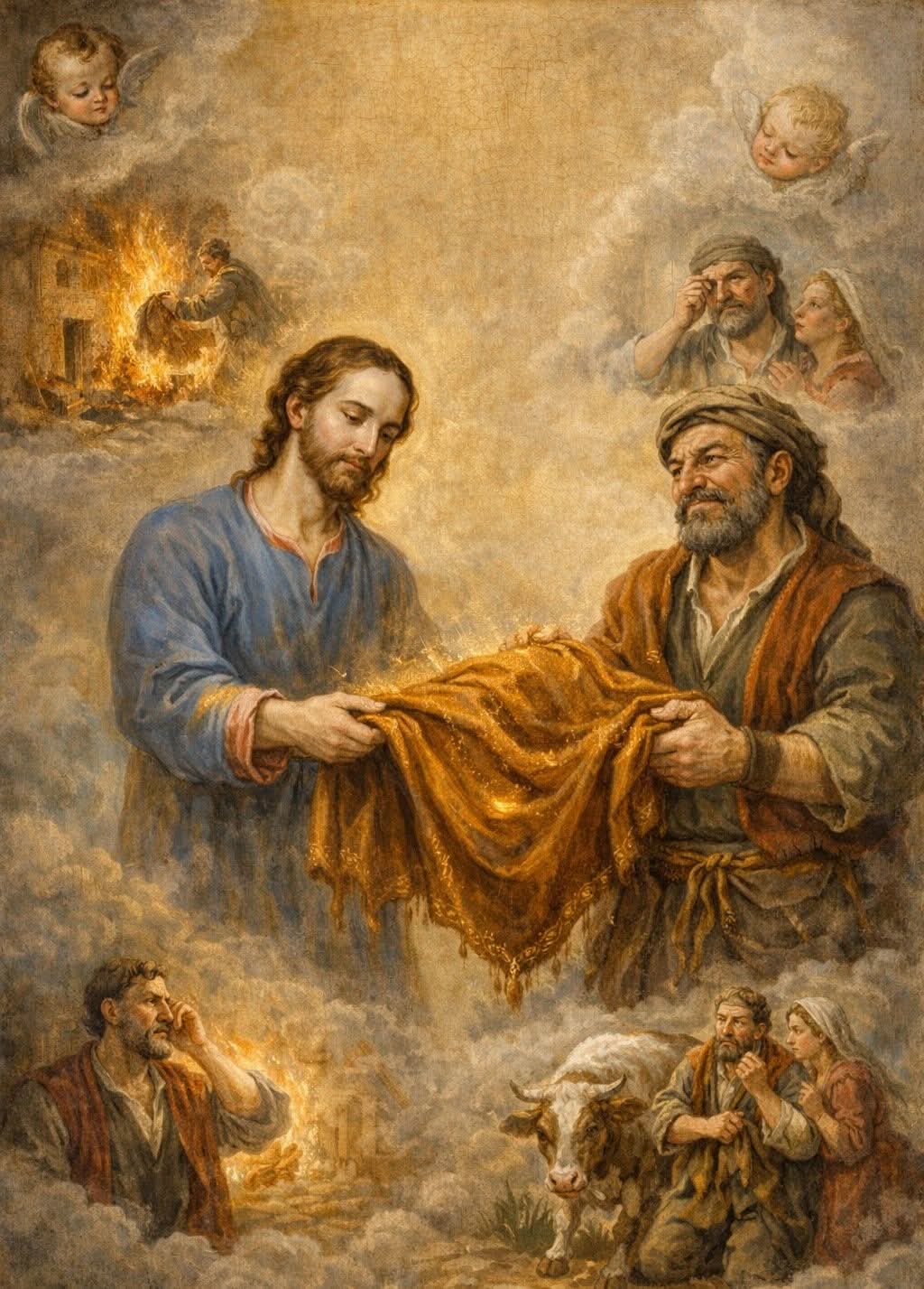 Algunos días después, llegaron a la puerta del carpintero de Nazaret. Tras entrar, el viejo usurero y su esposa Eva se postraron a los pies de José y María.
