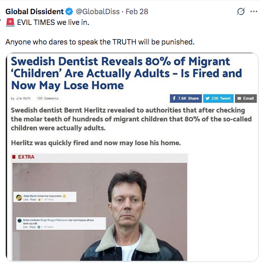 Un dentista sueco fue despedido y perdió su hogar tras examinar a «niños» migrantes y revelar que el 80% eran en realidad adultos.