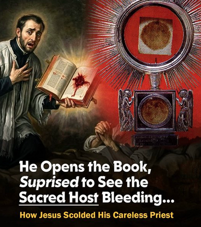 Cuando llegó y abrió el libro para dar el Viático, se quedó impactado: ¡la Hostia se había transformado en un coágulo de sangre viva y las páginas estaban manchadas con la Preciosa Sangre!