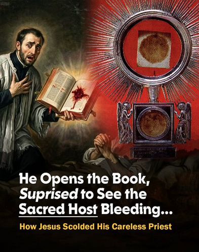 Debido a la falta de cuidado (o tal vez a una falta de fe en ese momento), en lugar de llevar el Santísimo Sacramento con reverencia en una teca (un recipiente de metal), colocó la Hostia consagrada entre las páginas de su libro de oraciones o breviario.