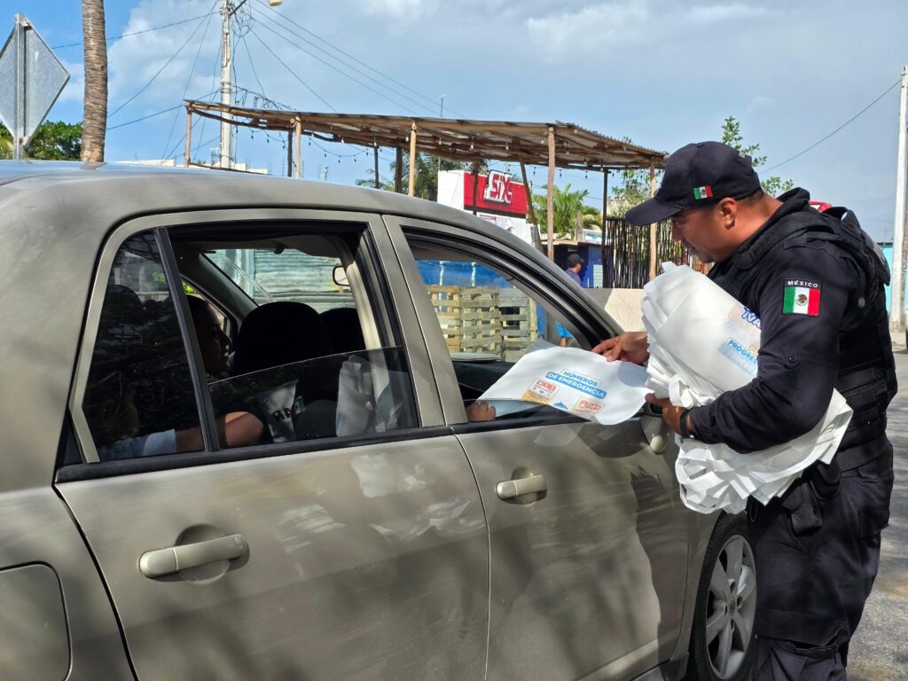 Durante la actividad, los agentes entregaron bolsas ecológicas con información útil para la población, entre la que se incluyen los números 911 para emergencias y 089 para realizar denuncias de manera anónima.