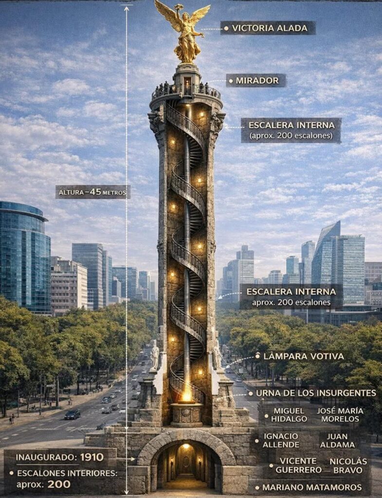 Aun así, el interior del Ángel sigue guardando algo único: un mausoleo, una escalera centenaria y la estructura interna de uno de los símbolos más importantes del país.