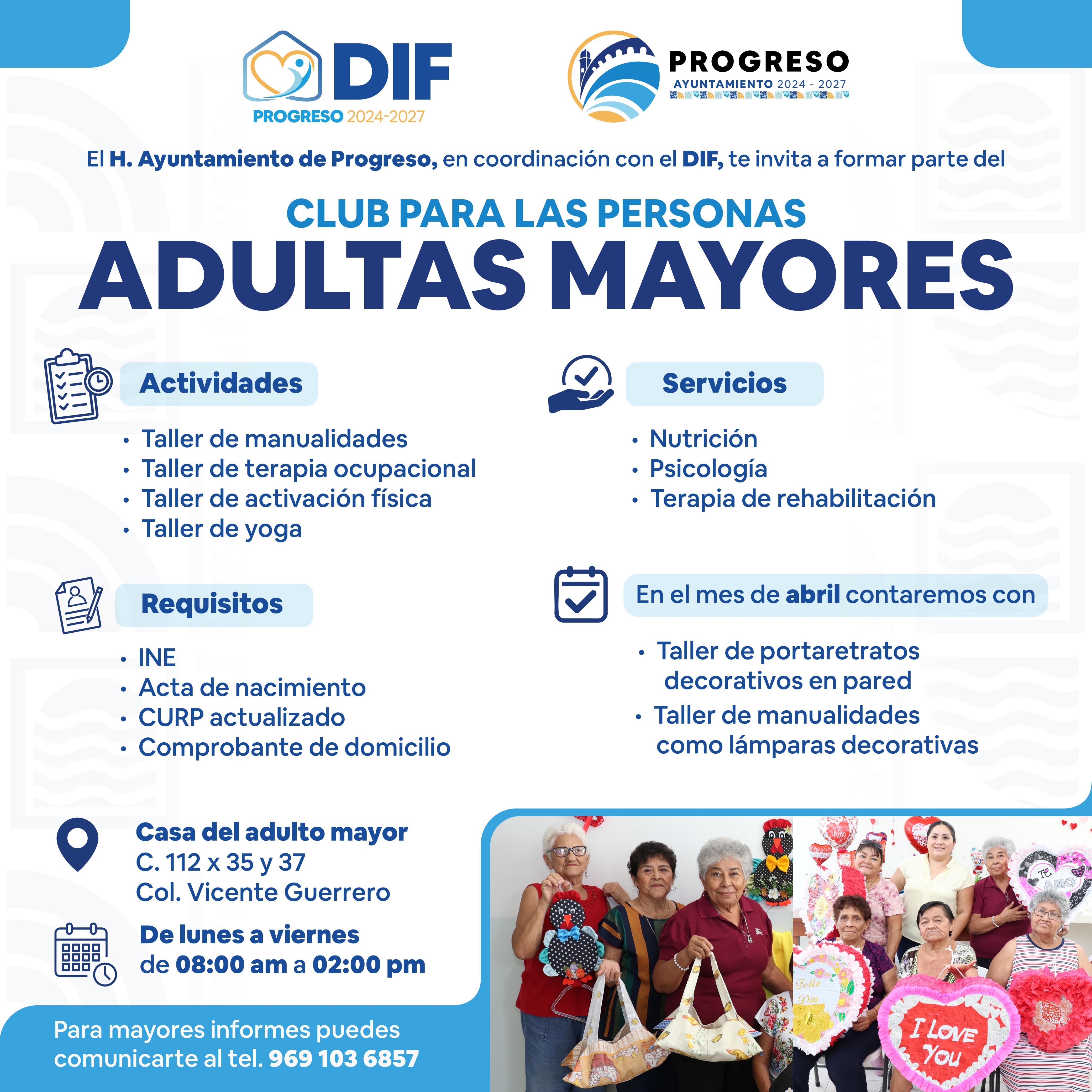 El H. Ayuntamiento de Progreso, encabezado por el alcalde Erik Rihani González, en coordinación con el DIF Municipal, invita a los adultos mayores a integrarse al Club para las Personas Adultas Mayores, un programa permanente que tiene como objetivo brindar atención integral y reconocer a este sector como parte fundamental de la sociedad, destacando su experiencia y sabiduría a través de actividades académicas, recreativas, deportivas y culturales.